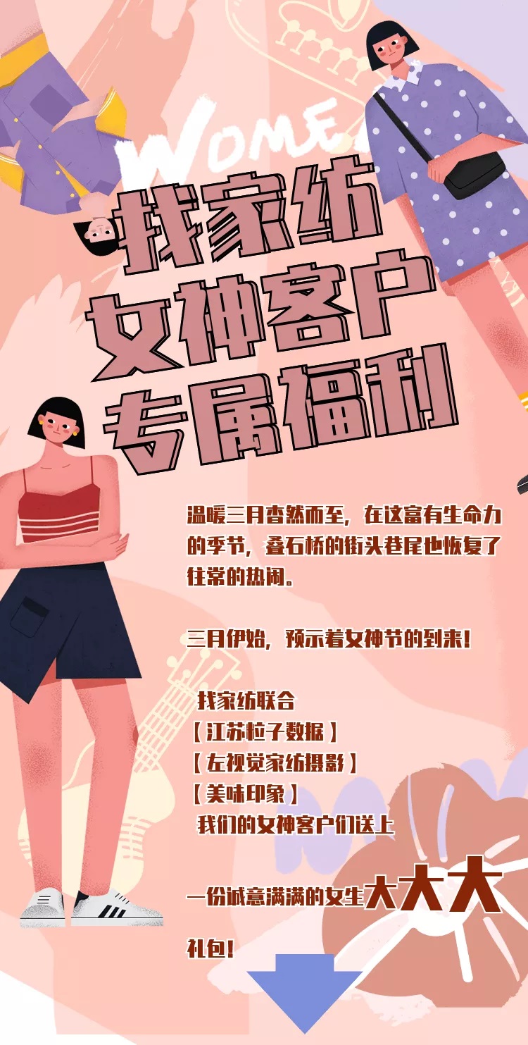 女神节如期而至,找家纺联合江苏粒子数据、左视觉家纺摄影、美味印象,为女神们准备了专属礼包。营销礼包、关怀礼包、企服大礼包,包含了找家纺的用心