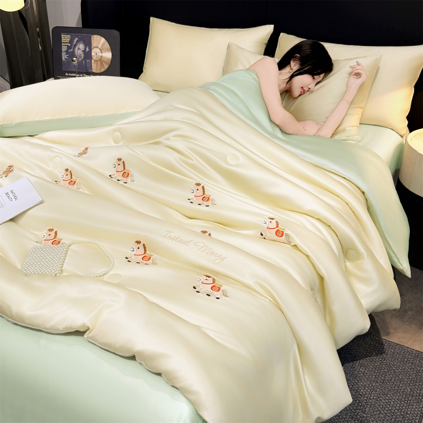 2026新款水洗真丝刺绣夏被四件套 150*200cm夏被 福马-奶黄绿