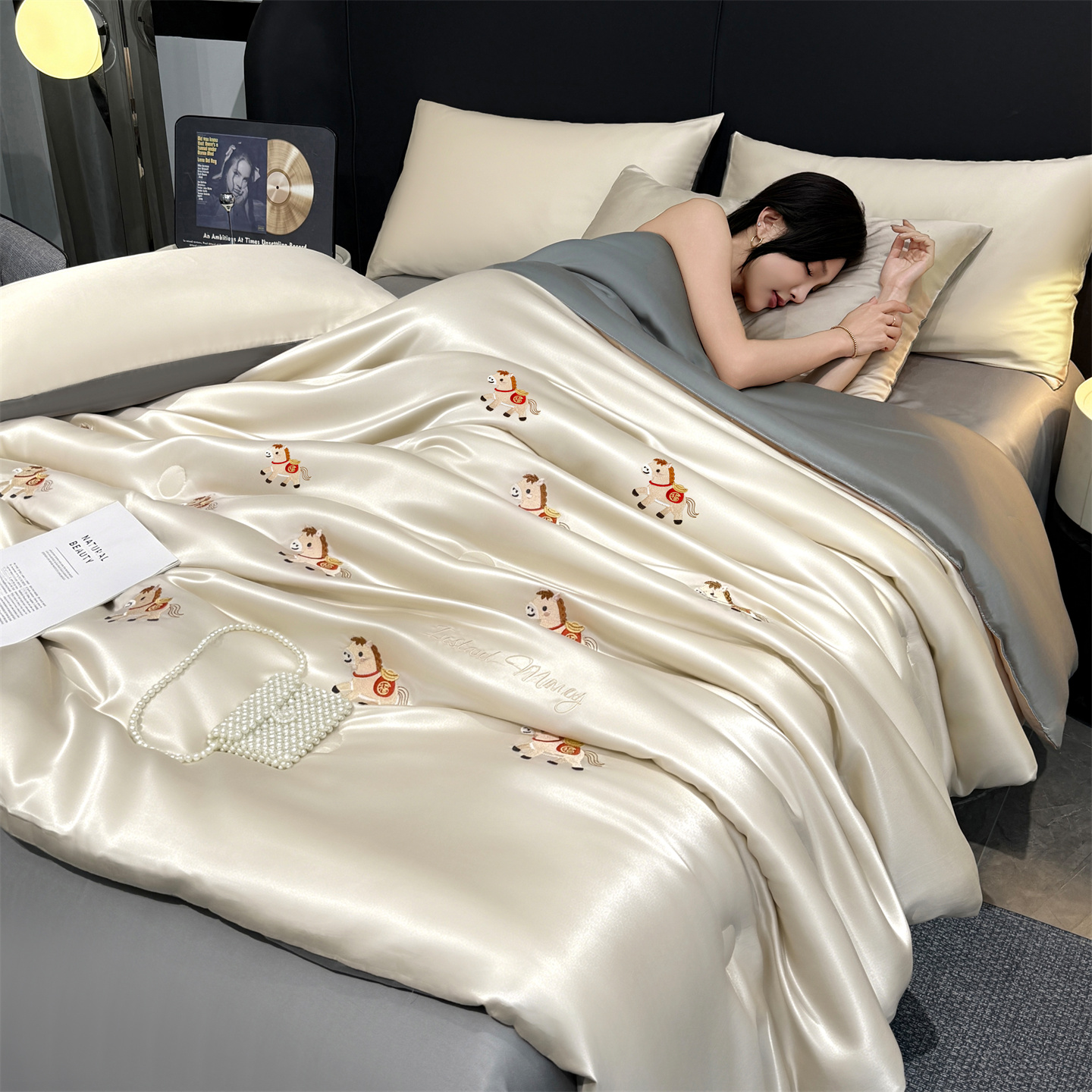 2026新款水洗真丝刺绣夏被四件套 150*200cm夏被 福马-香槟灰
