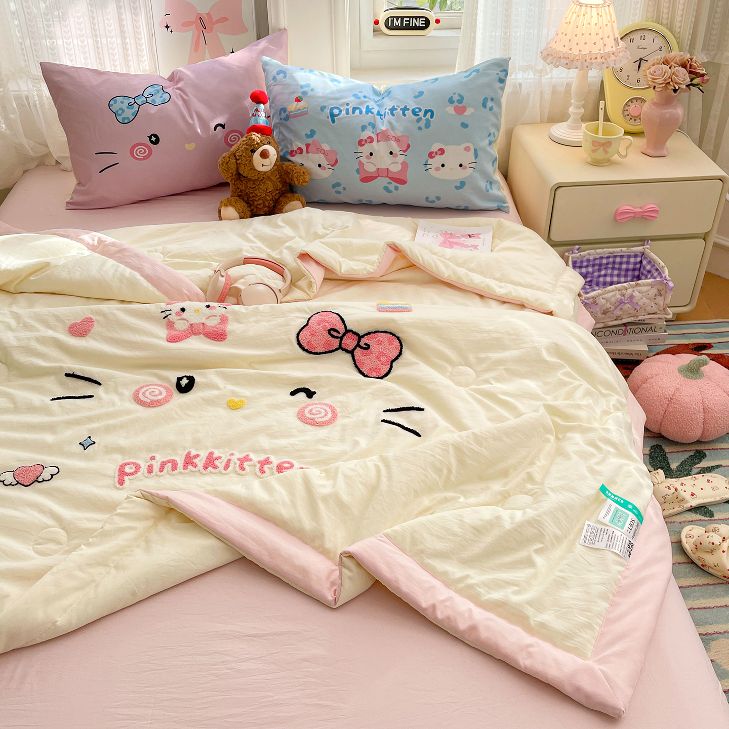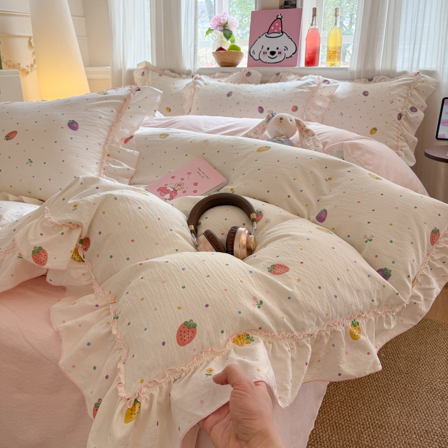 2026新款古法水洗仿棉云感纱四件套 150*200cm单被套 芝士莓莓熊