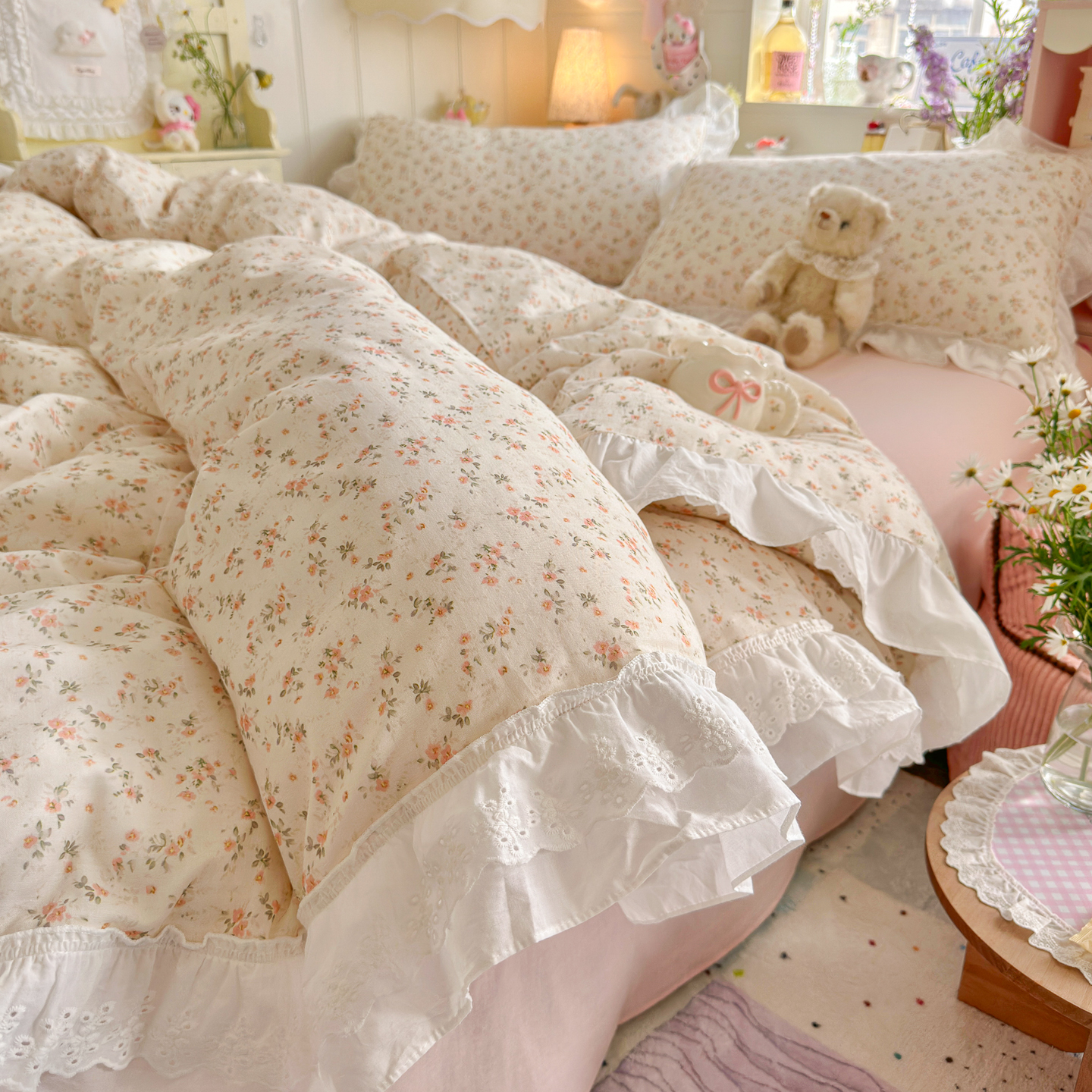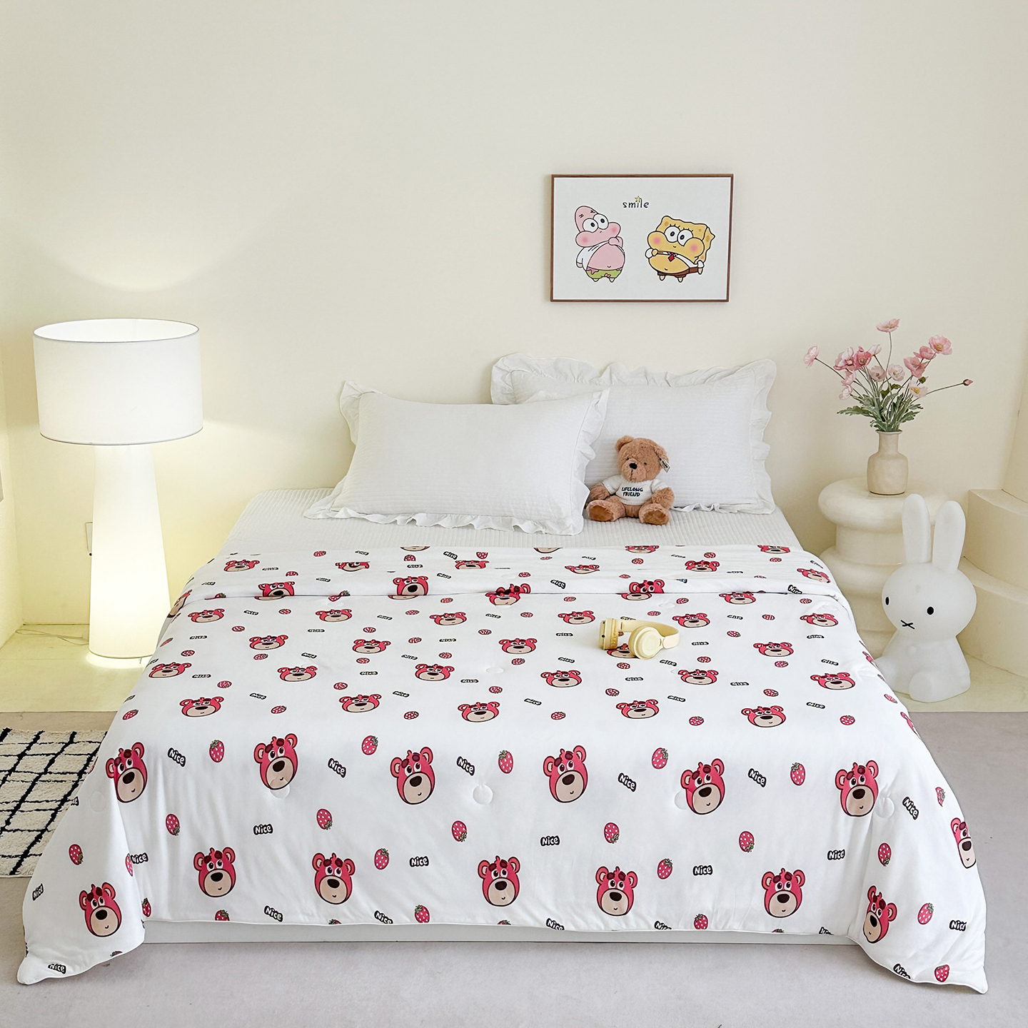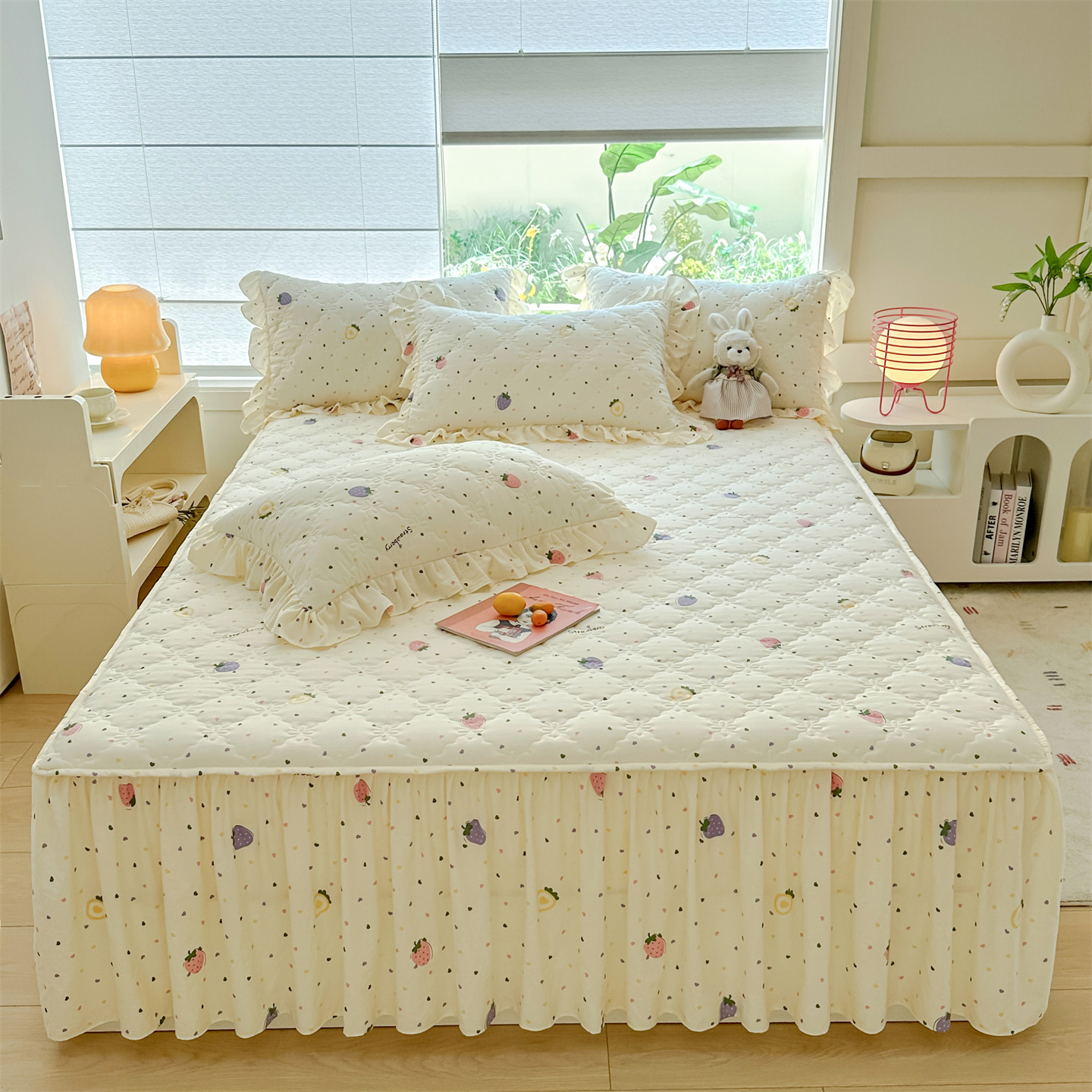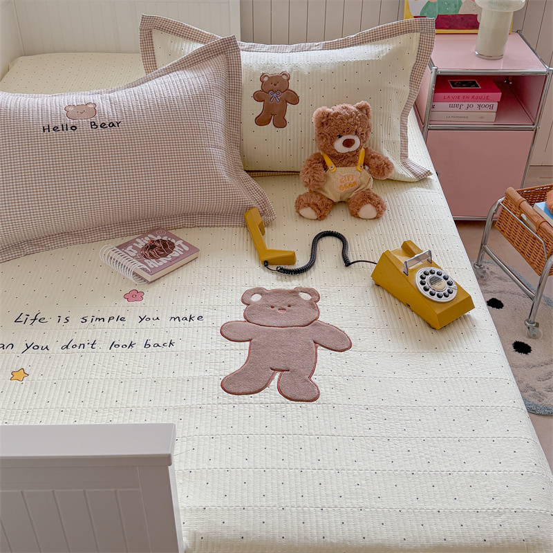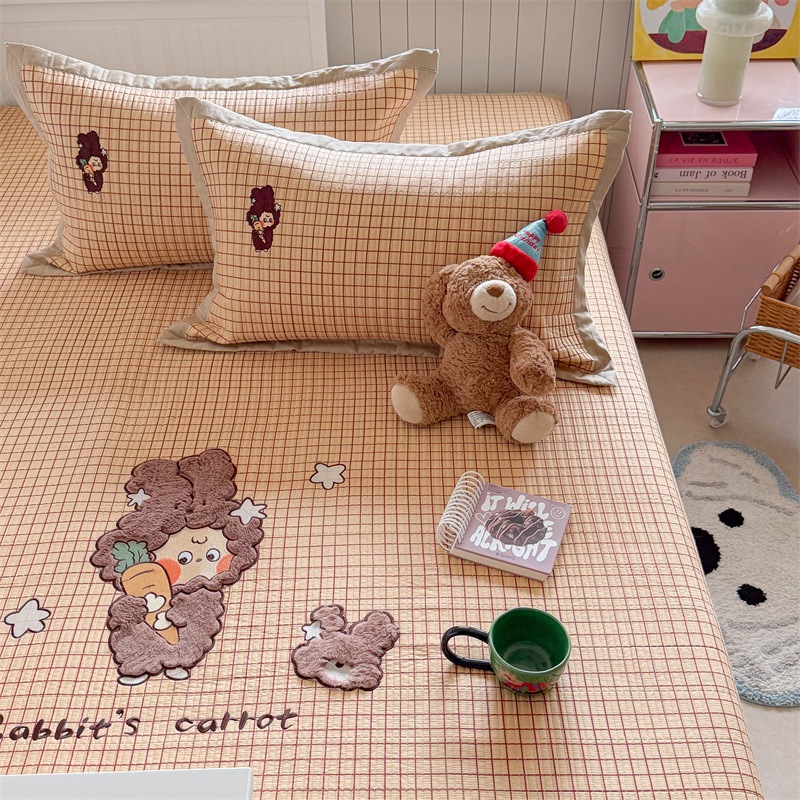 2026新款全棉夹棉卡通印花床裙三件套 夹棉枕套一对 碎花兔熊