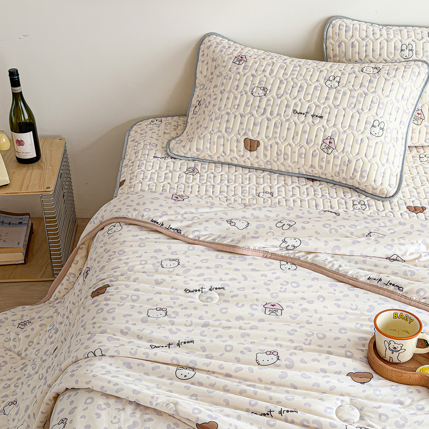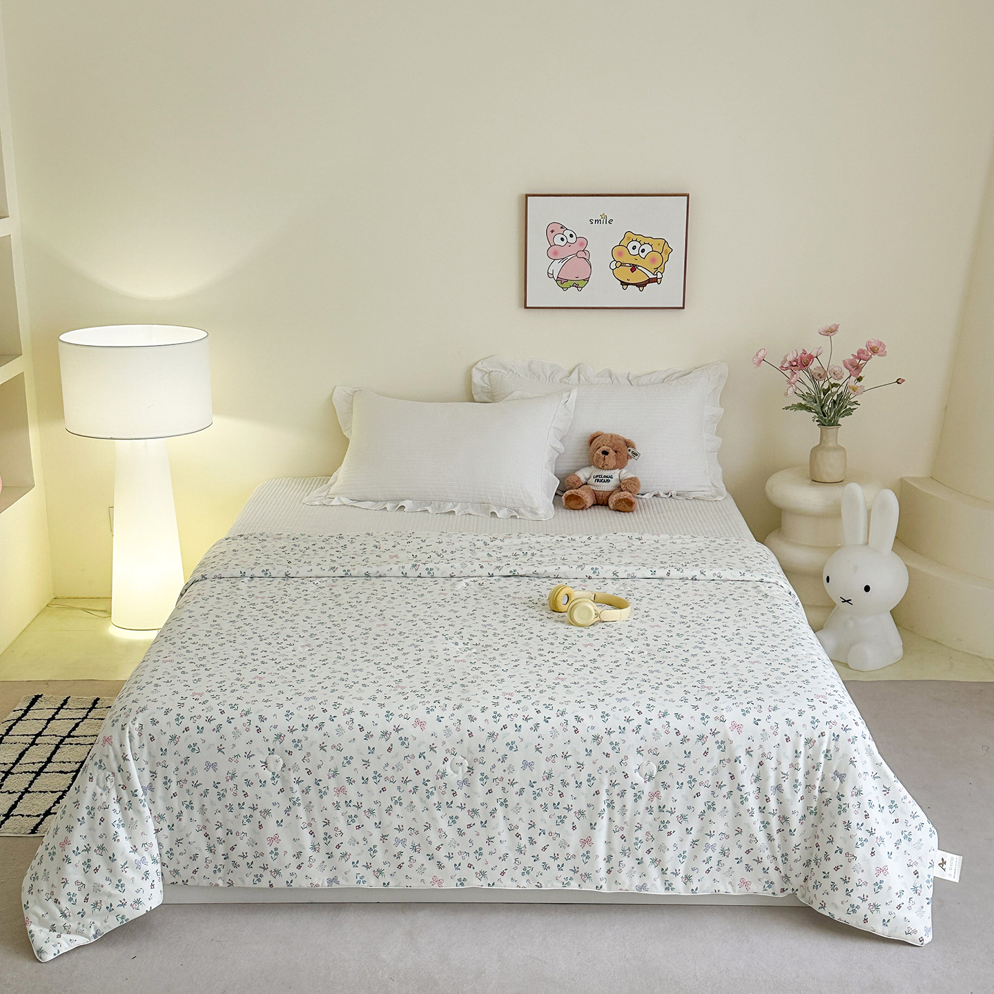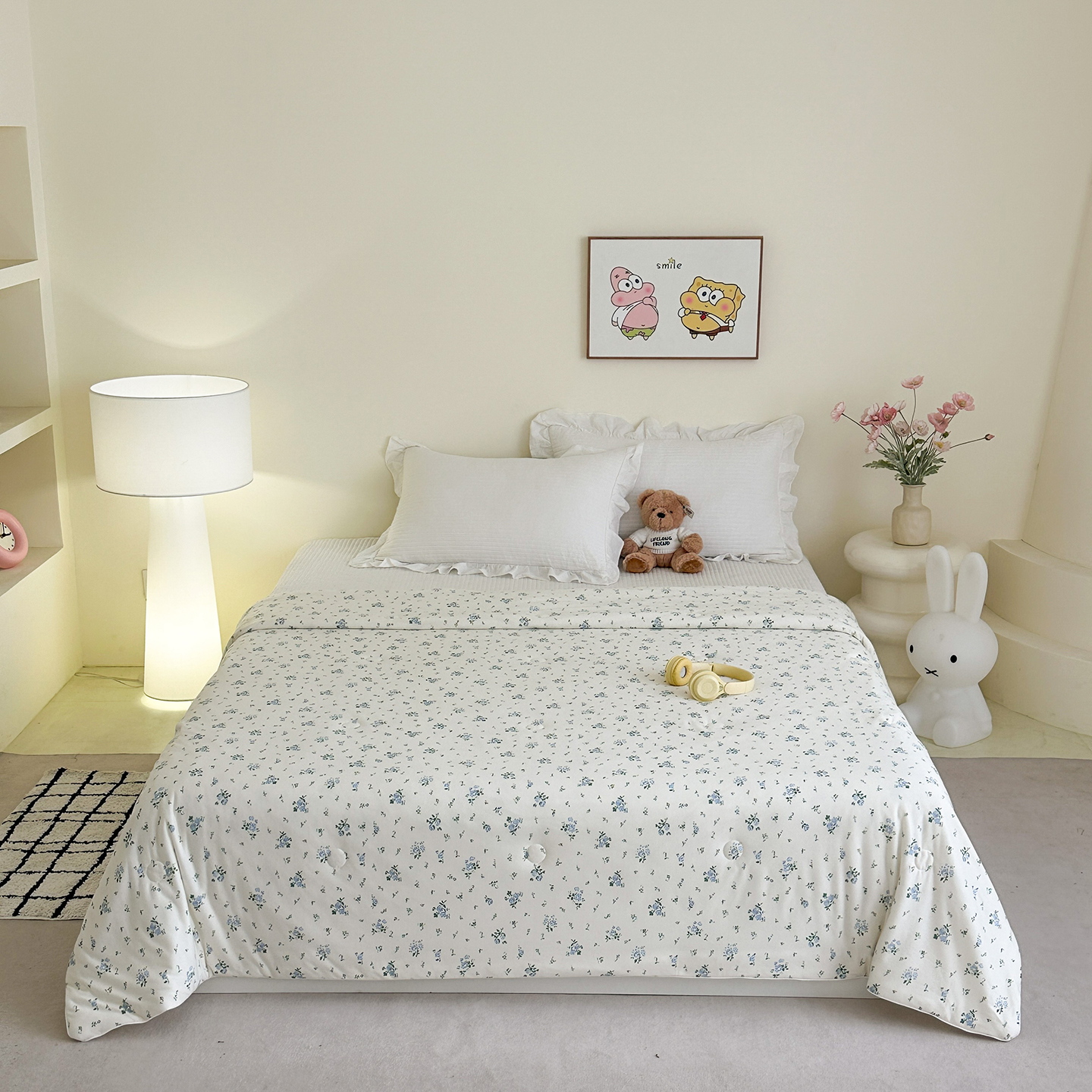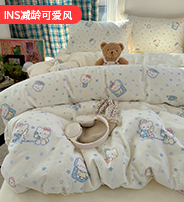 2026新款全棉夹棉卡通印花床裙三件套 夹棉枕套一对 碎花兔熊