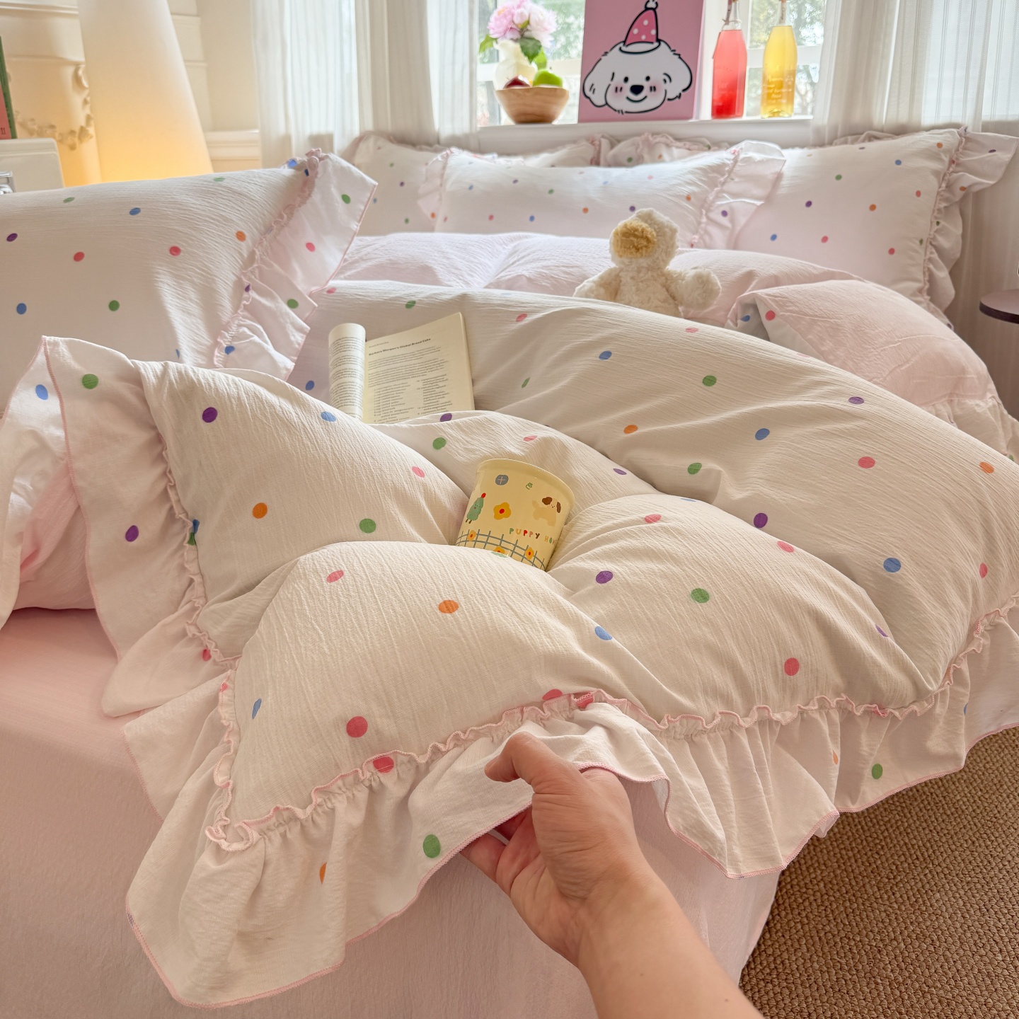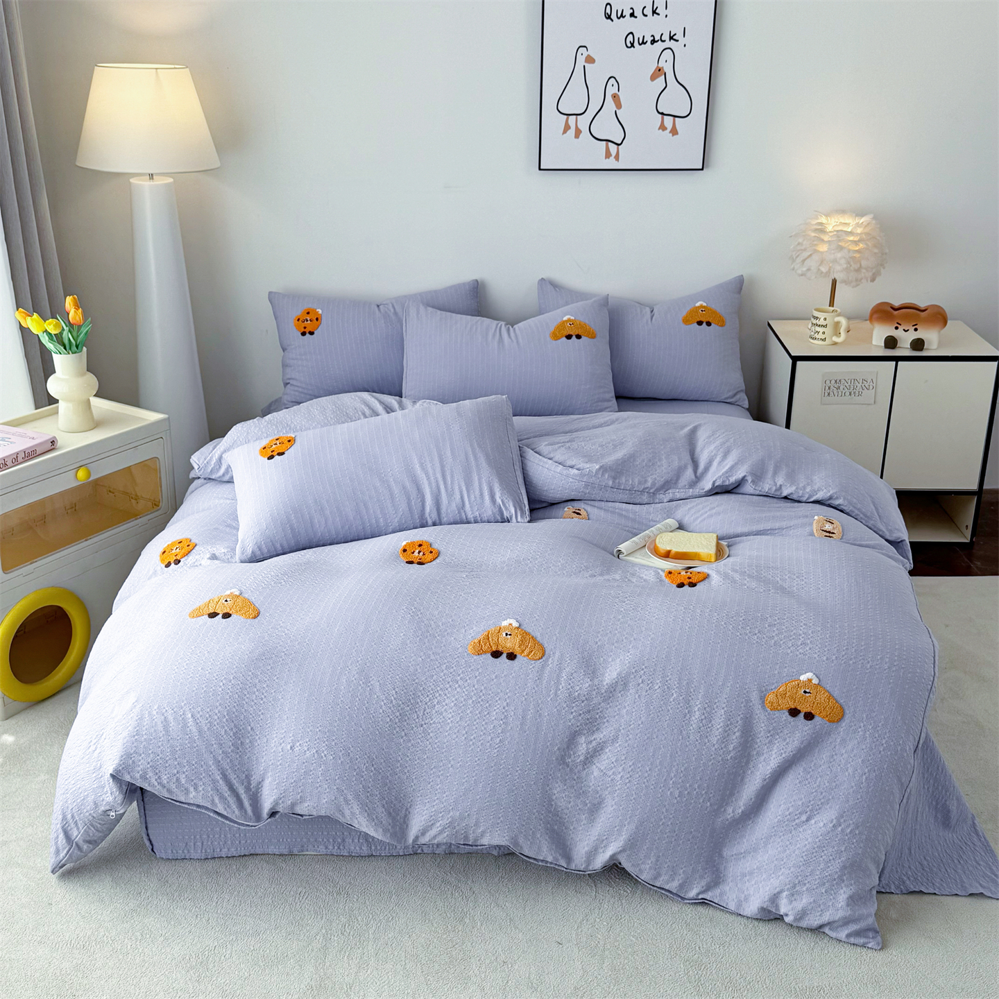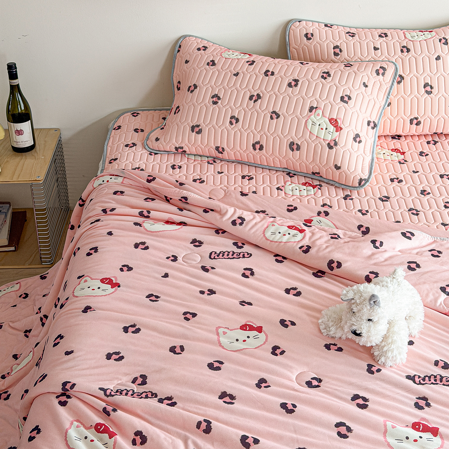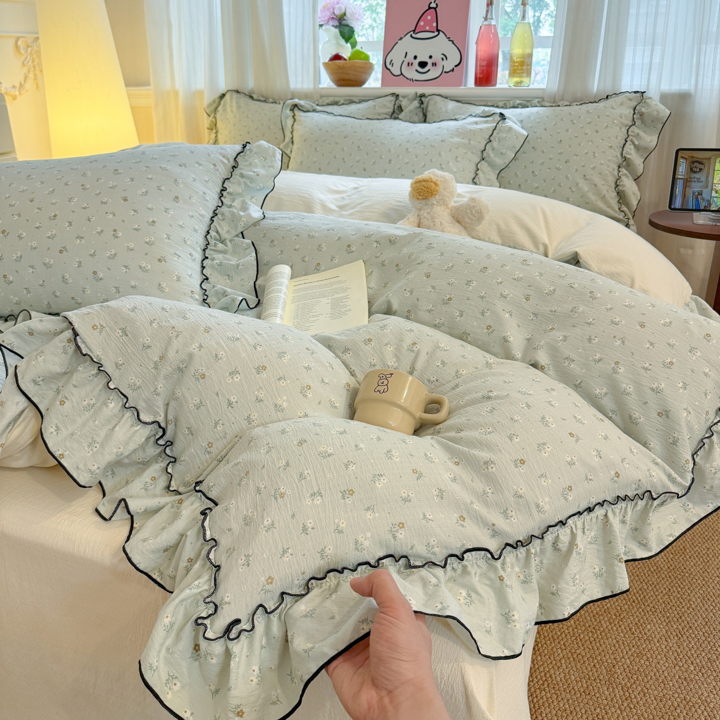 2026新款全棉夹棉卡通印花床裙三件套 夹棉枕套一对 碎花兔熊