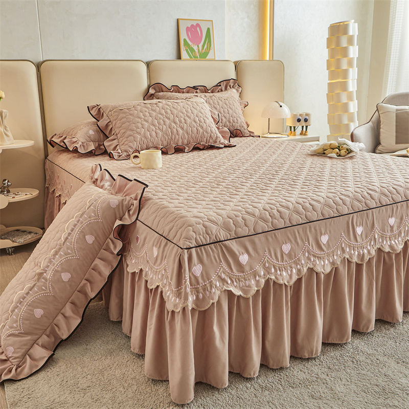 2025新款柔感磨毛花边夹棉床裙三件套-西米亚 120*200 西米亚-卡其