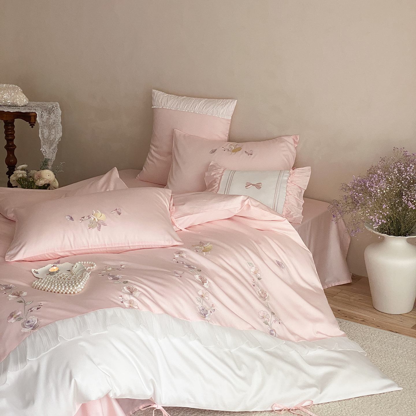 2026新款全棉刺绣棉边印花夹棉床裙三件套 夹棉枕套一对 雾里花眠