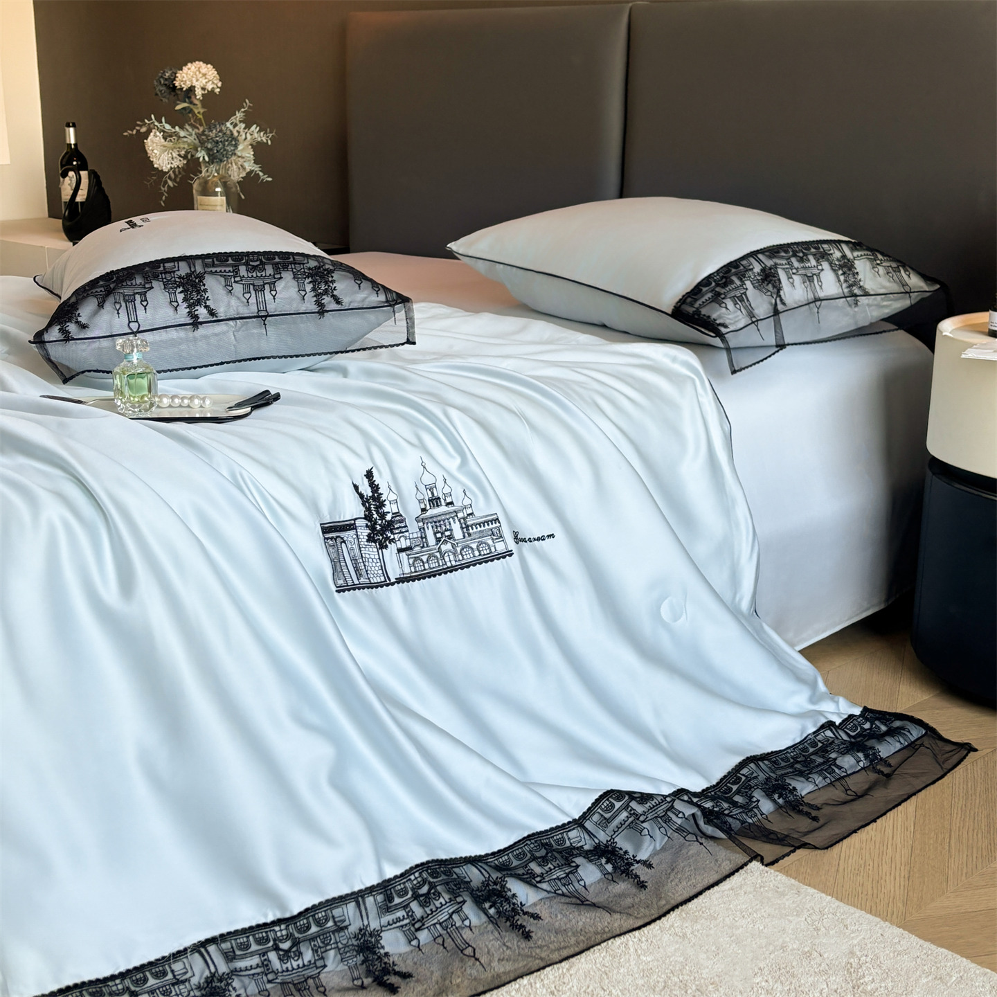 2026新款轻奢款水洗真丝刺绣数码宽边夏被四件套-格调 245*250单床单一条 格调-薄雾灰