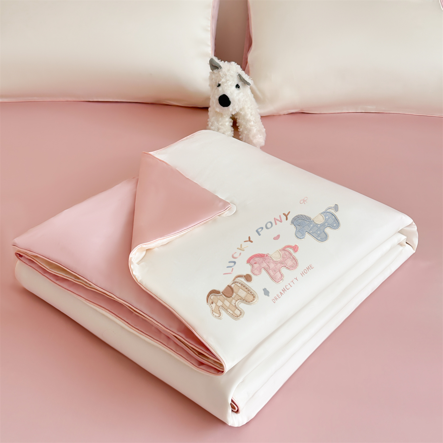 2026新款水洗冰丝刺绣夏被-三只小马系列 150*200cm单夏被 三只小马-奶昔白+奶油粉