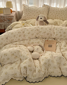 全棉双层纱皱皱蕾丝花边四件套
