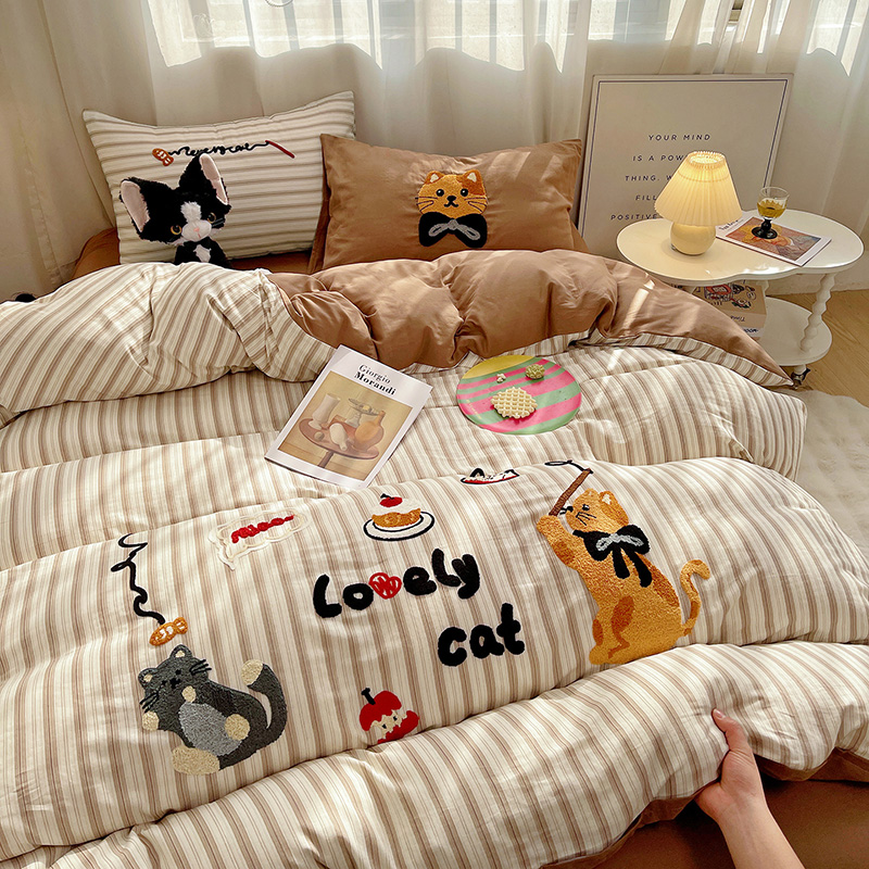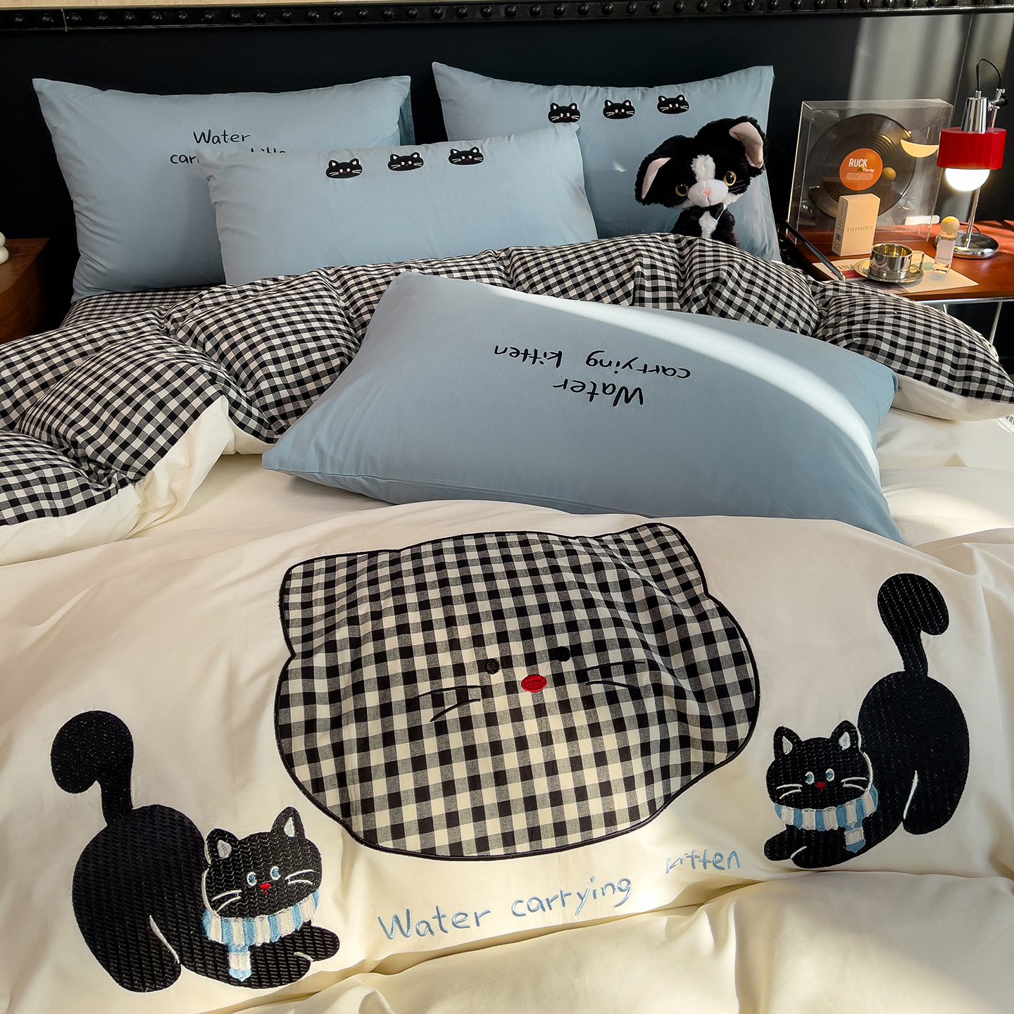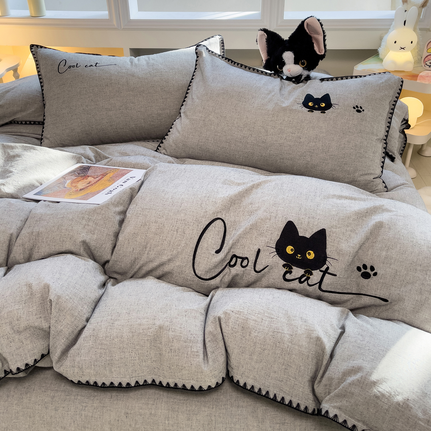 - 2026新款A类棉麻刺绣卡通贝壳边四件套-布鲁系列 布鲁-小猫