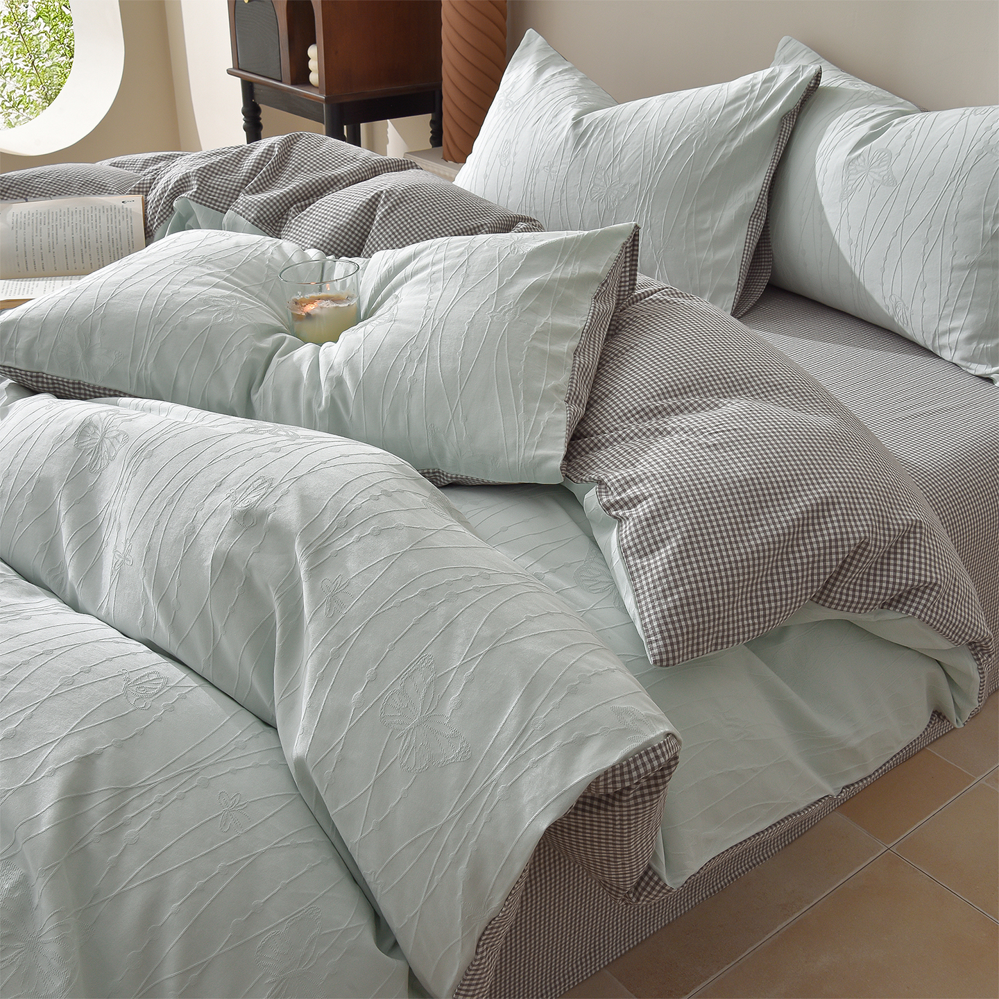 - 2026新款A类60支水洗棉立体浮雕提花全棉四件套-幻蝶系列 幻蝶-奶绿