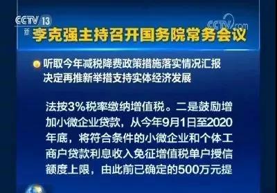 会议鼓励增加小微企业贷款,从今年9月1日至2020年底,将符合条件的小微企业和个体工商户贷款利息收入免征增值税单户授信额度上限,由此前已确定的500万元进一步提高到1000万元。