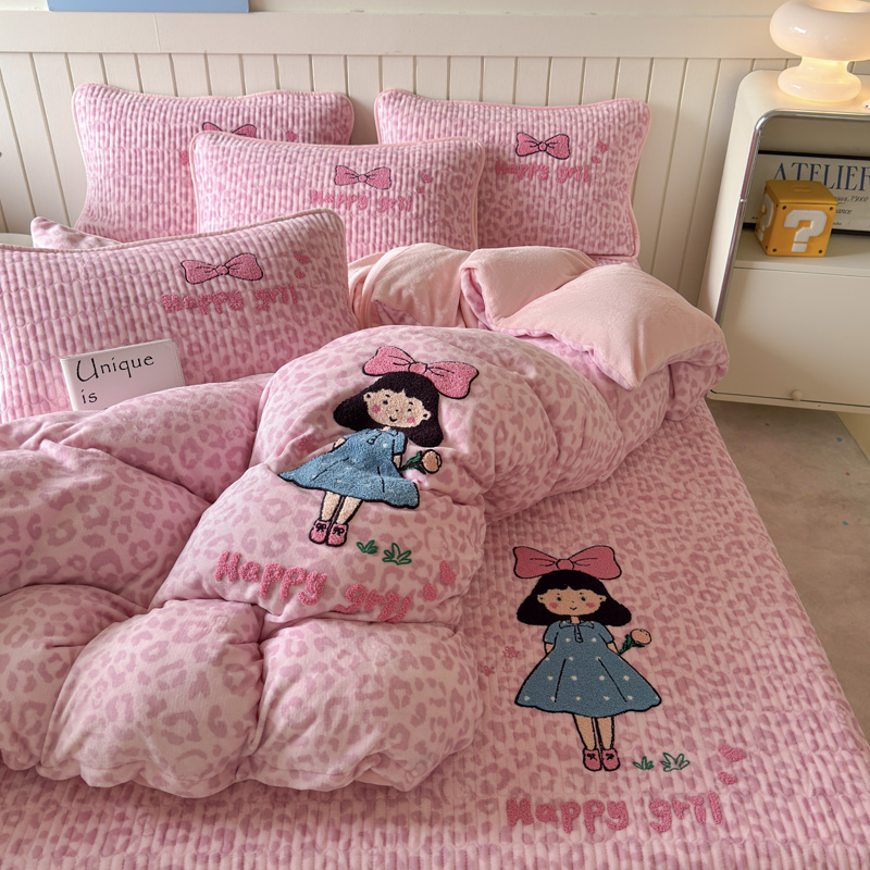 - 2025新款牛奶绒卡通刺绣四件套-可可熊系列 可可熊-藕粉+香薰紫