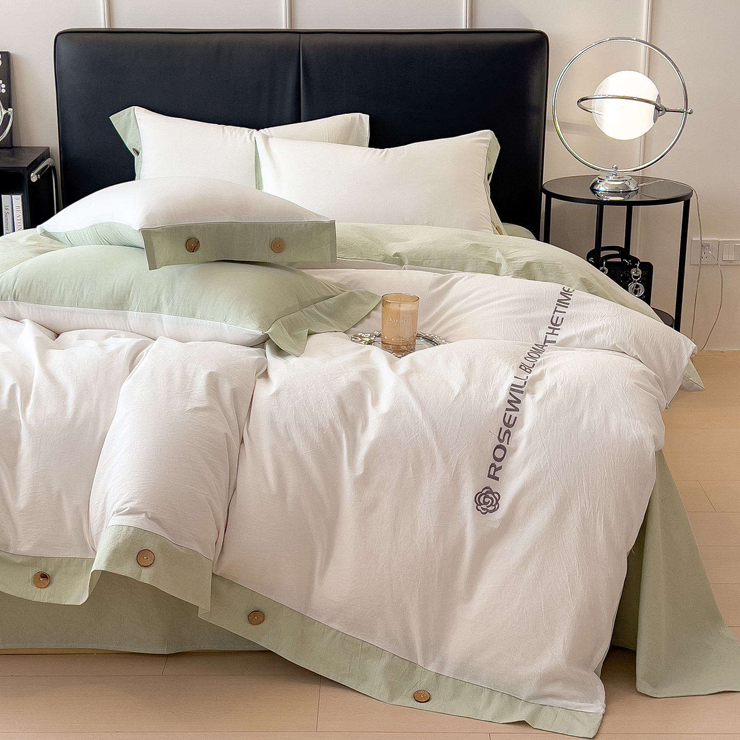 - 2025新款A类全棉色织水洗棉纽扣绣花四件套 纽扣款-白色拼浅绿