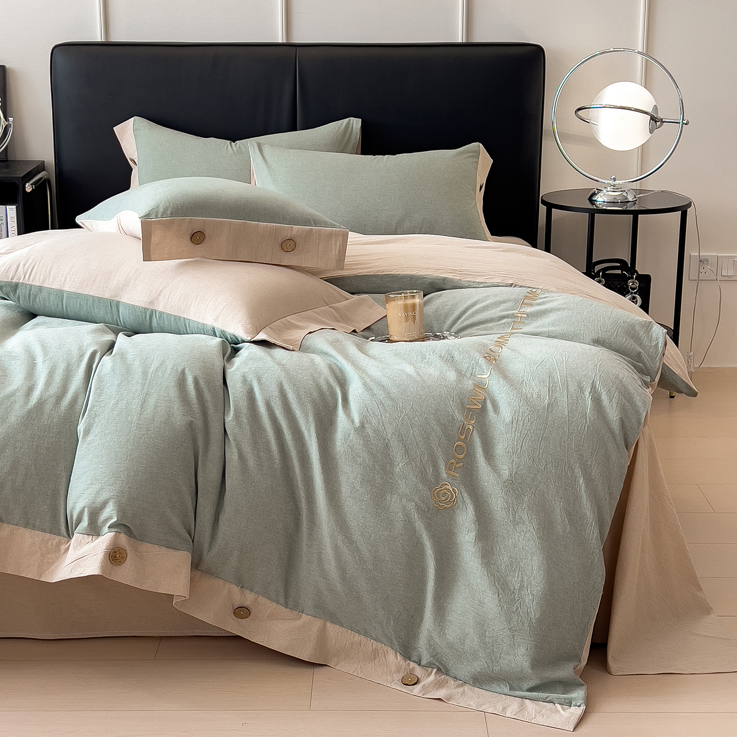 - 2025新款A类全棉色织水洗棉纽扣绣花四件套 纽扣款-浅绿拼浅灰