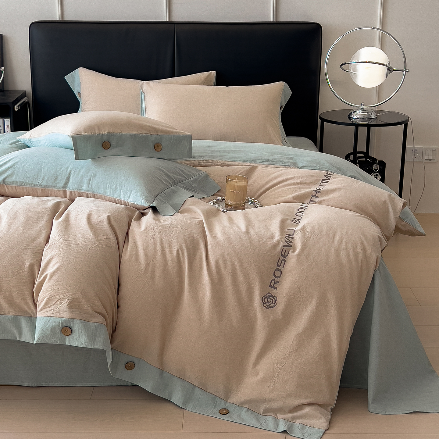- 2025新款A类全棉色织水洗棉纽扣绣花四件套 纽扣款-卡其拼浅绿