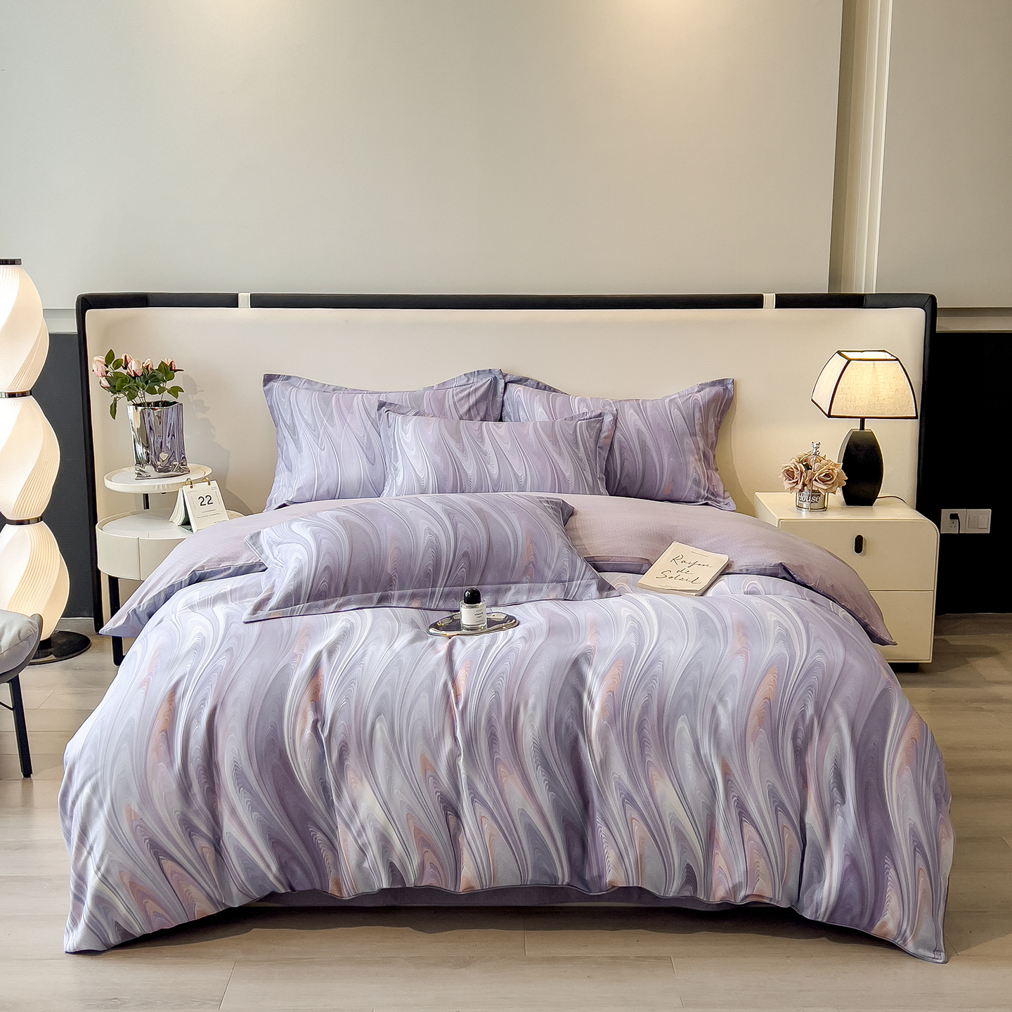 - 2025新款A类全棉色织水洗棉纽扣绣花四件套 纽扣款-浅紫拼浅粉