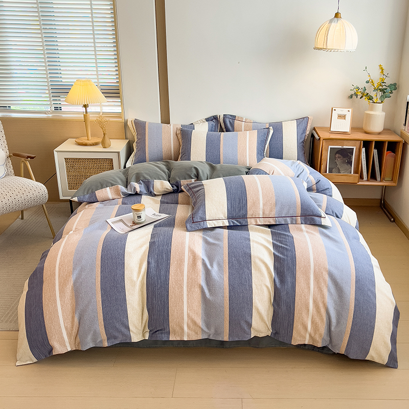 - 2025新款A类全棉色织水洗棉纽扣绣花四件套 纽扣款-蓝灰拼浅灰
