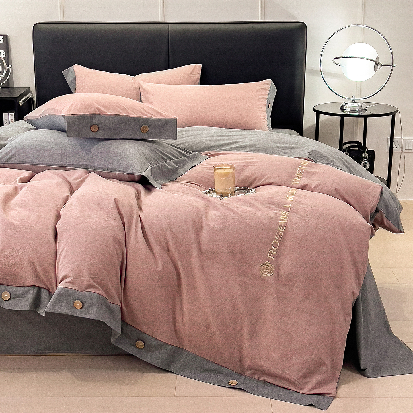 - 2025新款A类全棉色织水洗棉纽扣绣花四件套 纽扣款-浅粉拼浅灰