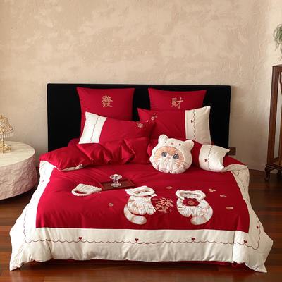 - 2026新款100支高精密刺绣长绒棉四件套-发财猫 发财猫-红