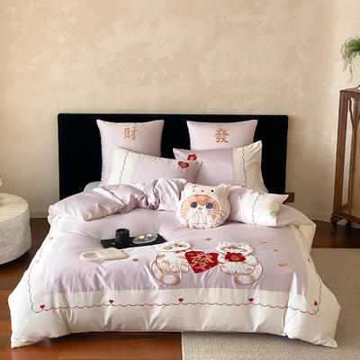 - 2026新款100支高精密刺绣长绒棉四件套-发财猫 发财猫-紫