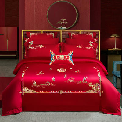 - 2025新款100s长绒棉贡缎提花重工艺刺绣婚庆四件套多件套 百花贺喜红