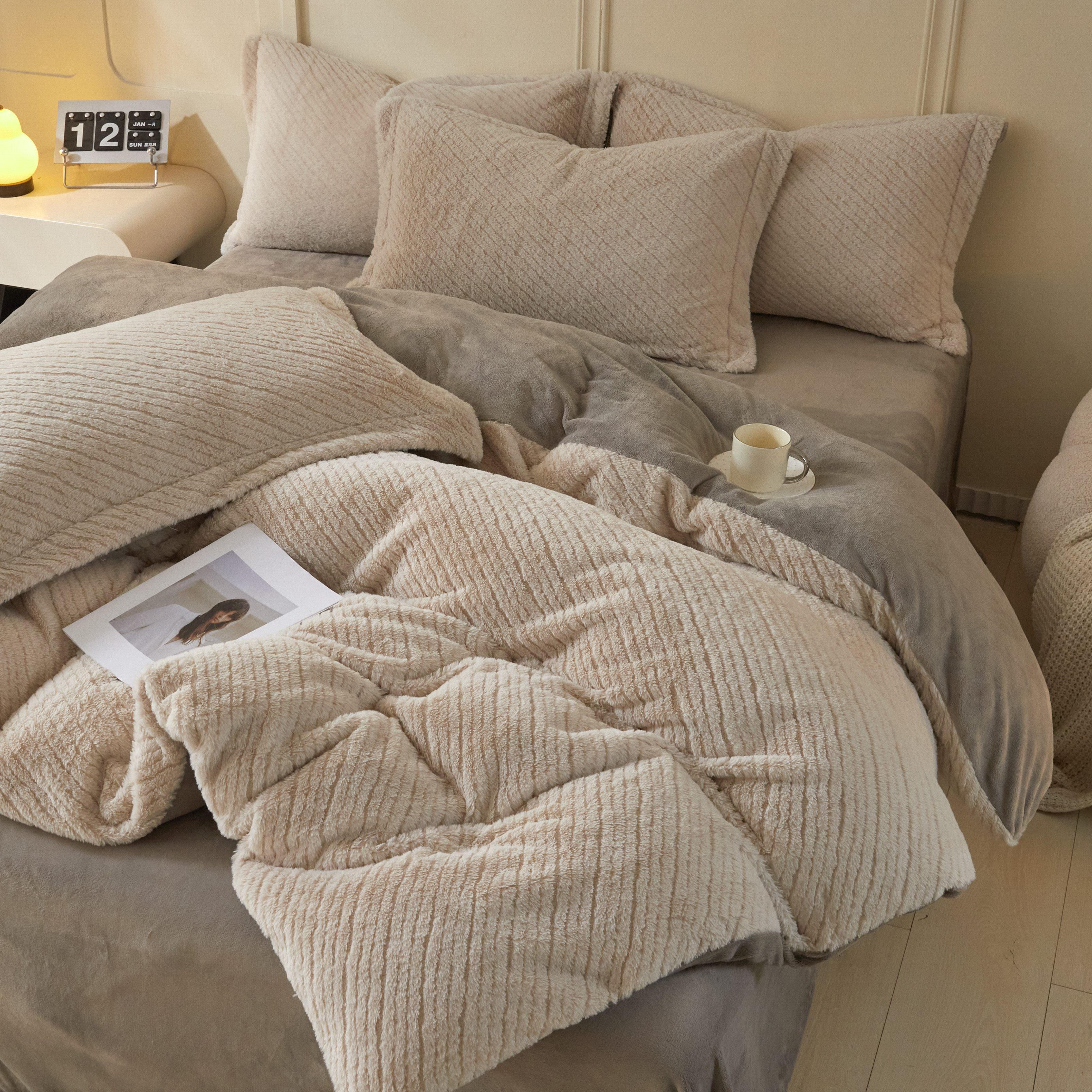 - 2025新款仿羊绒四件套高克重牛奶绒四件套仿羊绒格子条纹四件套