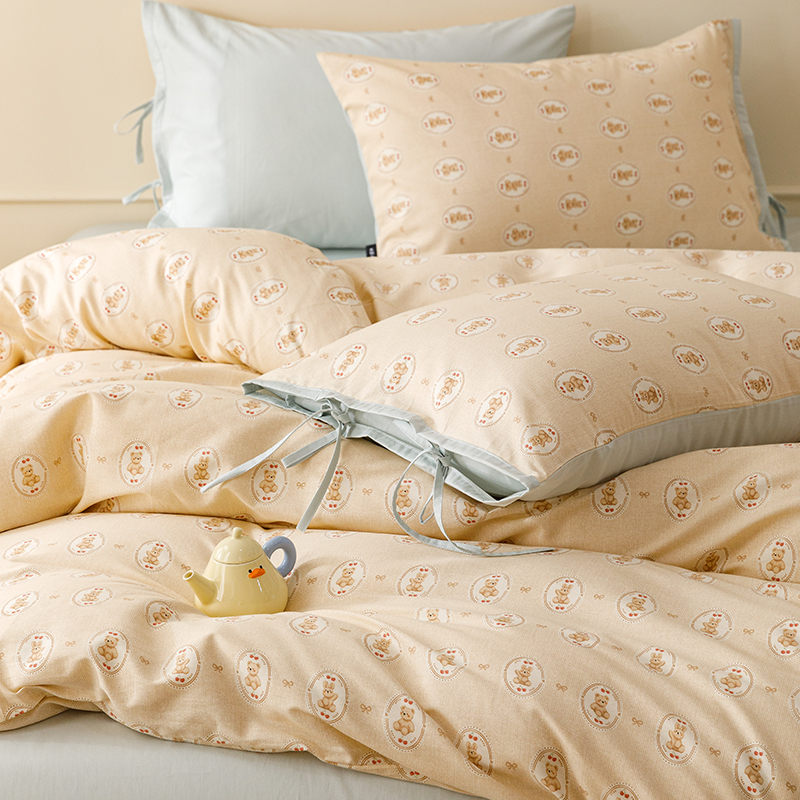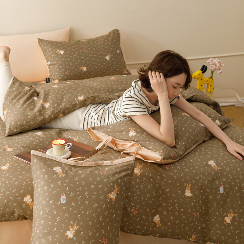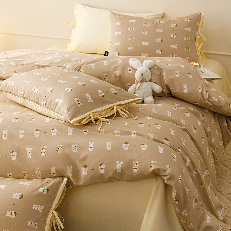 - 2026春夏全棉奶油小卡通印花绑带款四件套 布偶兔兔-咖