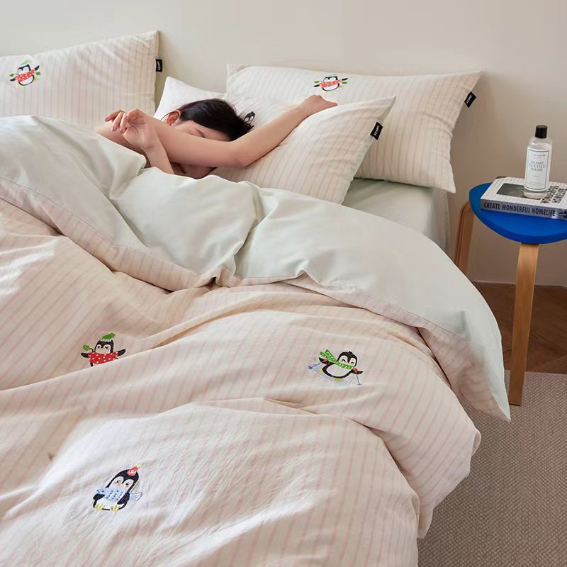 - 2026春夏全棉色织水洗棉萌趣小刺绣四件套系列 企鹅精灵