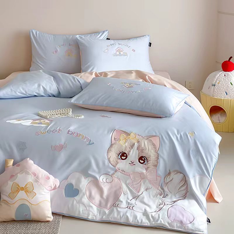 - 2026春夏全棉60支长绒棉软萌贴布绣四件套— 元气阿喵 元气阿喵-蓝