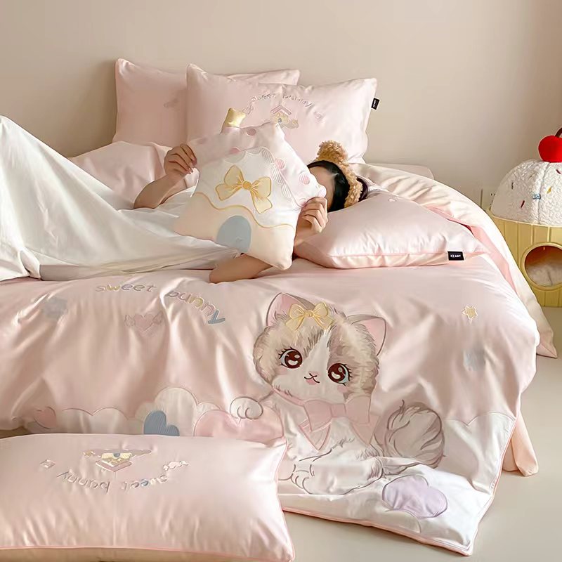- 2026春夏全棉60支长绒棉软萌贴布绣四件套— 元气阿喵 元气阿喵-粉