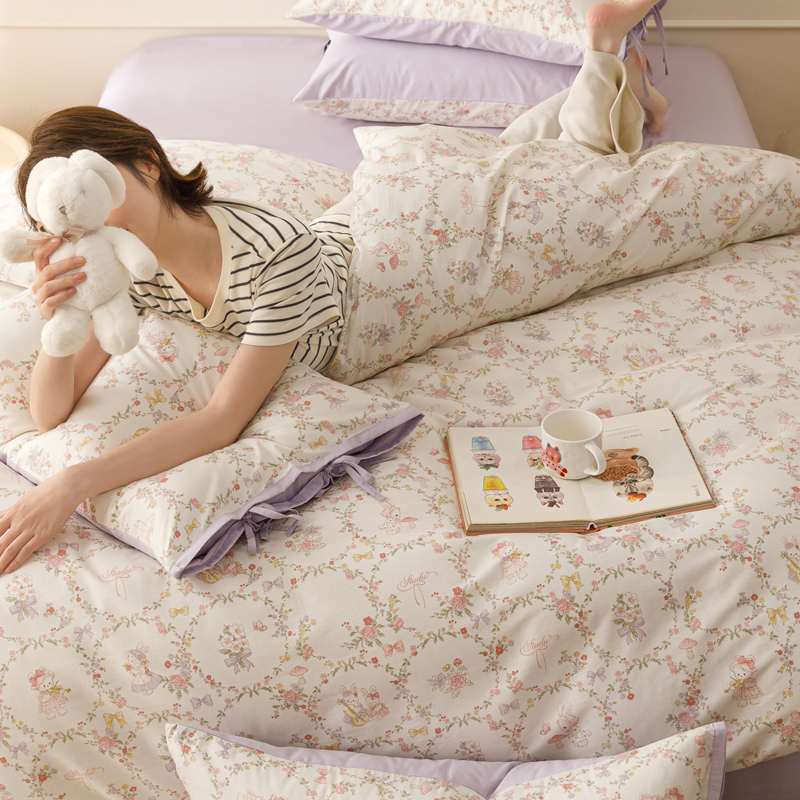 - 2026春夏全棉奶油小卡通印花绑带款四件套 童话花町