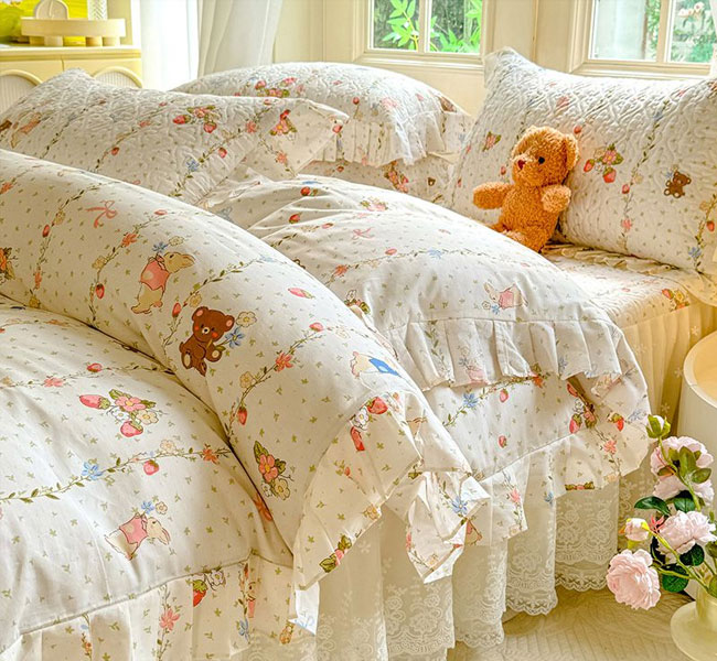 2024新款全棉夹棉绗缝床裙三件套纯棉印花法式四件套套件蕾丝公主风